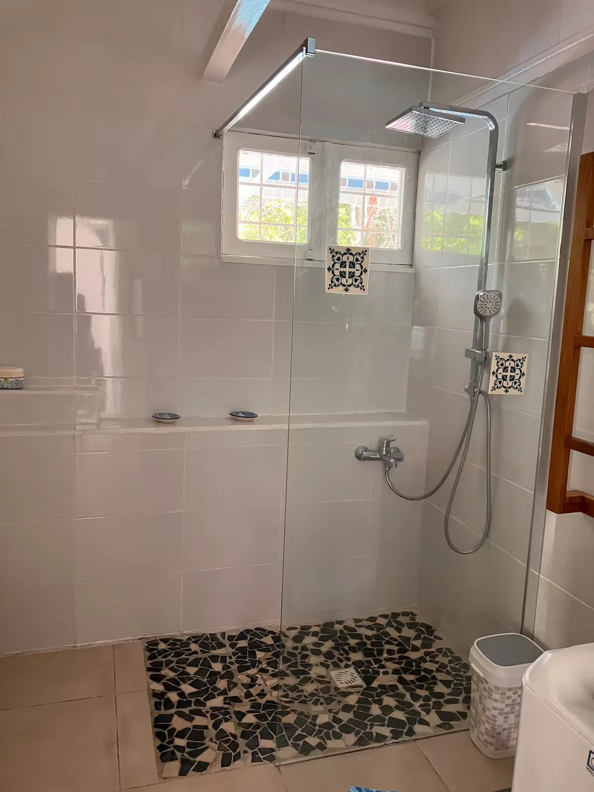 Deux salles de bain à l'intérieur pour le quotidien. Des WC séparés. Et puis cette douche extérieure, en plein air, entourée de plantes. Un petit luxe qui change tout.